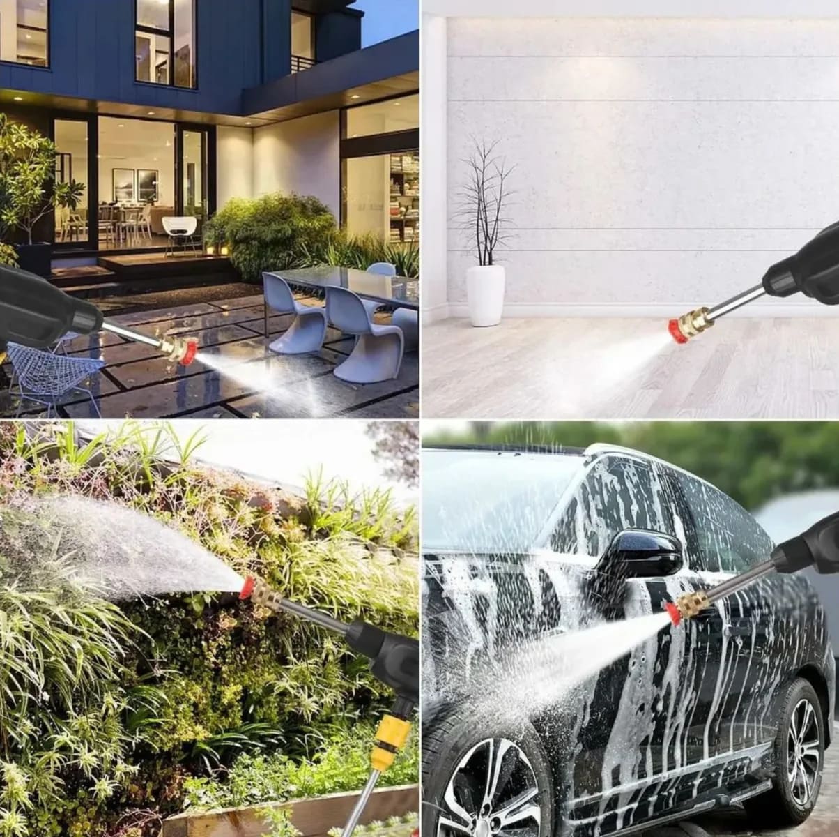 📌1 x Hidrolavadora portátil 📌1 x Batería de 98V 📌1 x cargador de batería 📌1 x Manguera de agua 5 metros 📌1 x Frasco para detergente 📌 1 x Varilla metálica de 20 cm 📌1 x Boquilla para salida 0° (ángulo estrecho) 📌1 x Boquilla para salida 40° (ángulo amplio) 📌1 x Camarilla de filtro 📌1 x Boquilla roscada 📌1 x Maleta de presentación